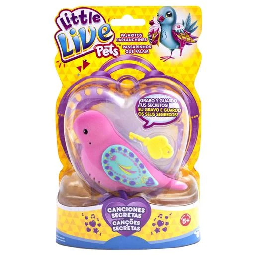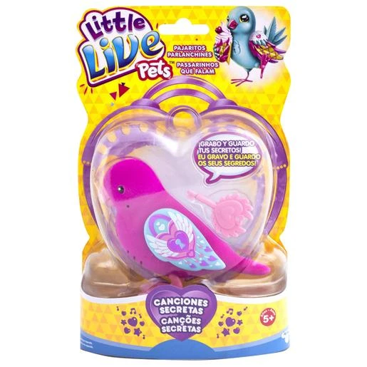 Los pajaritos parlanchines The Little Live Pets son muy divertidos. El pajarito te responde cuando acaricias su nuca, canta una melodía, o pía, o silba. Tiene en total 30 sonidos diferentes que irás descubriendo a medida que vas acariciándole. Cuanto más juegas con él más contento se pone. ¡Alucina con las divertidas melodías de este pajarito, también puedes grabarte a ti mismo cantando! ¡Hasta 10 segundos! Edad recomendada + 5 años.