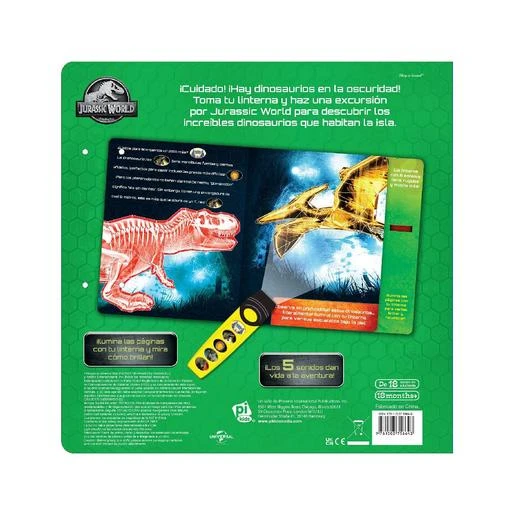 ¡¡Cuidado porque hay dinosaurios en la oscuridad!! Deberás coger la linterna que viene en el libro y hacer una excursión por Jurassic World para descubrir los increíbles dinosaurios que habitan la isla.