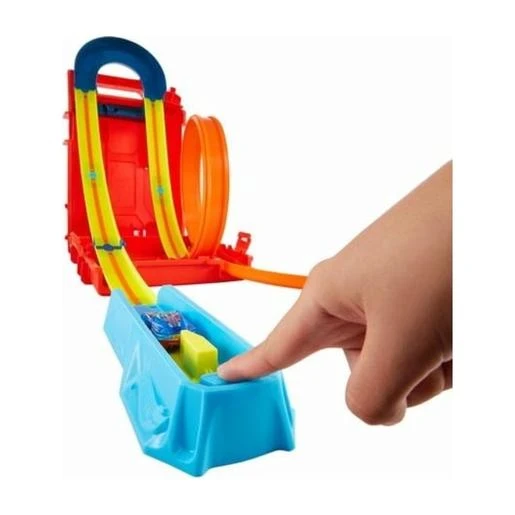 La caja del embalaje no solo sirve de almacenamiento útil y muy chula, sino que también se transforma en parte de la pista de juego. Se abre en ángulo recto para que el coche acelere en vertical antes del loop final.