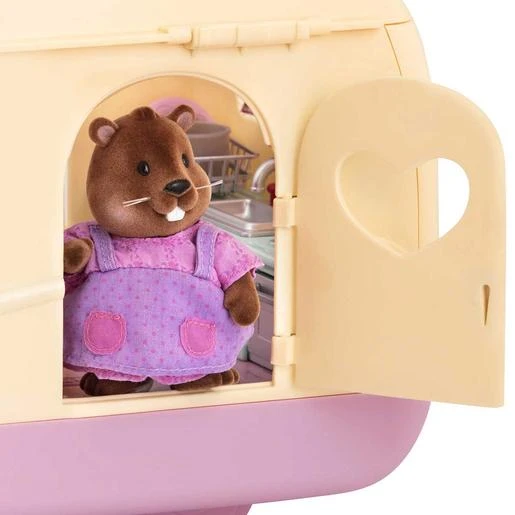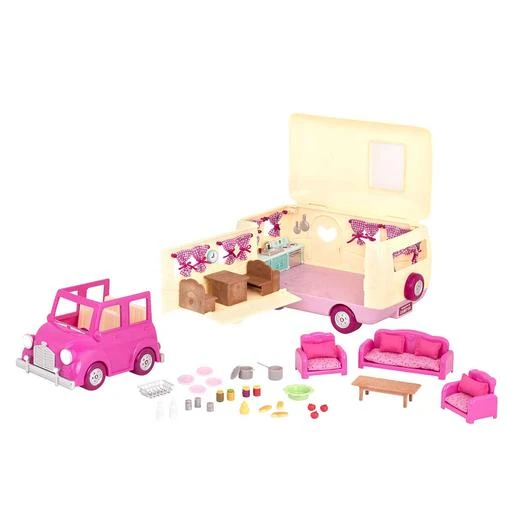 Este juego incluye un hermoso coche rosa y una caravana, con mucho espacio de almacenamiento y accesorios en miniatura. El techo de la caravana se abre para que puedas colocar sus figuras de animales en la cocina o en el área de la sala de estar. Hay accesorios de cocina y comida de juguete como pan, manzanas y mantequilla de cacahuete, para que puedan hacer bocadillos. También se incluye un montón de muebles, con sillones que se pliegan en camas. ¡Tus personajes animales tendrán el mejor viaje por carretera de todos los tiempos!
